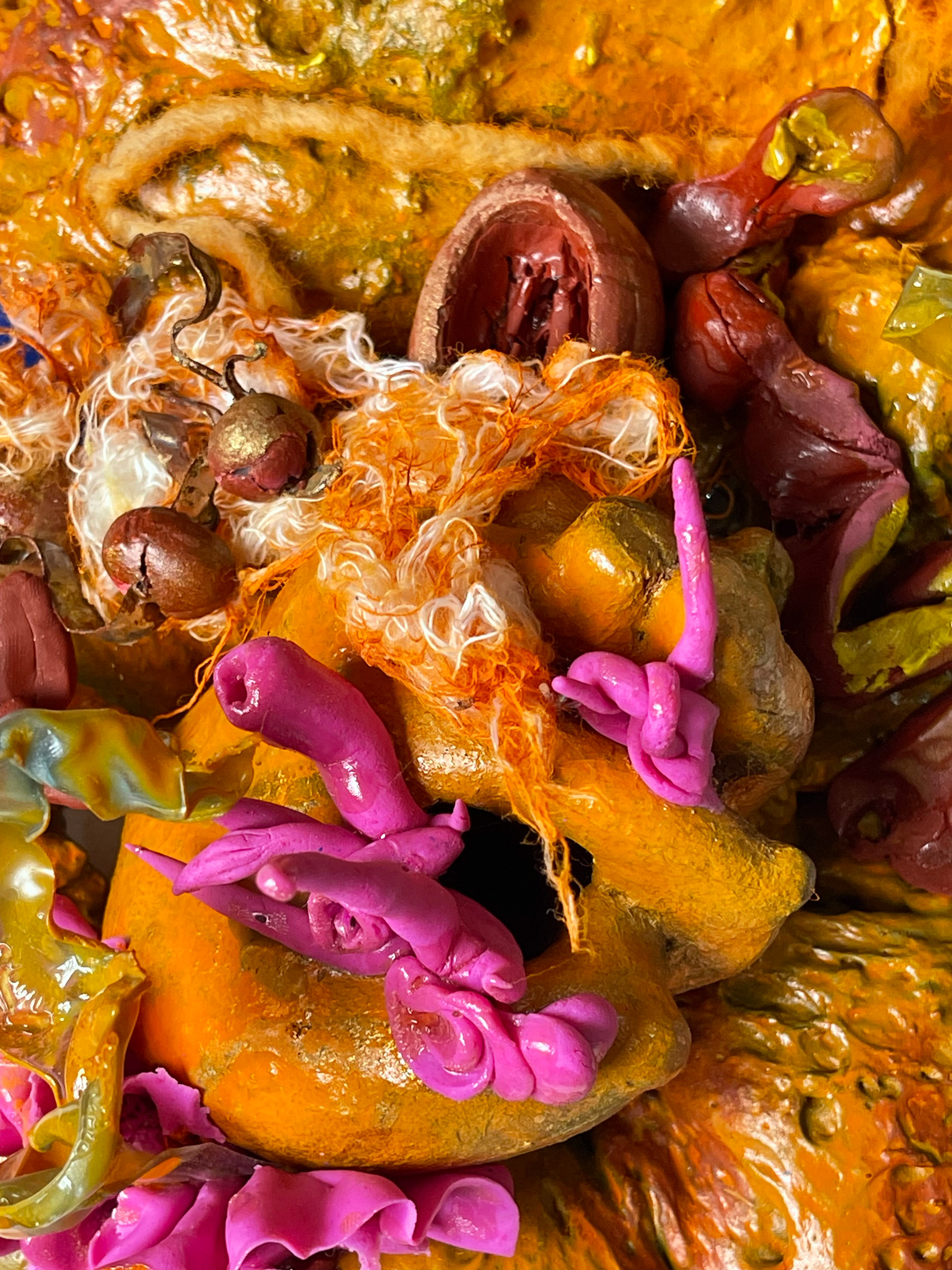 Este jardín es una casa hecha de pasillos oscuros y de ventanales abiertos, de órganos expuestos que se recorren a través de un mapa emocional dibujado con lo que se rompe, se pierde y se encuentra. Los materiales —restos de cuadros, textiles olvidados, objetos rescatados— dialogan con el cuerpo como archivo de memoria, trauma, deseo y renacimiento. Las piezas se descomponen y resurgen, adoptando nuevas formas: flores cerámicas que brotan del barro, líquidos viscosos, mujeres-animales que encarnan las vivencias cotidianas, con lo etéreo y lo salvaje, con la algarabía de sus bestias internas.